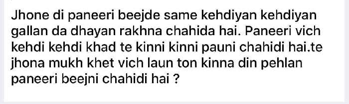 sukhwinder g 25 dina di paneeri mukh khet de vich lgauni hai...iss ton vaddi paneeri shi nahi hundi hai....8kg beej ikk kille di paneeri tyar krn lyi kafi hai jis da ki tuc 3 marle thaa de vich shitta de skde ho...paneeri de lyi tha level kr ke oss ton baad jdo pani lagoge pani subah jaldi ate sham nu suraj dhalan ton baad dena hai...dine paneeri de vich pani nahi khada rehn dena hai...nahi tan pani garam ho ke paneeri nu macha dewega....kanal di 2.5 kg urea da shitta dena hai, jdo paneeri vaddi ho jawe...