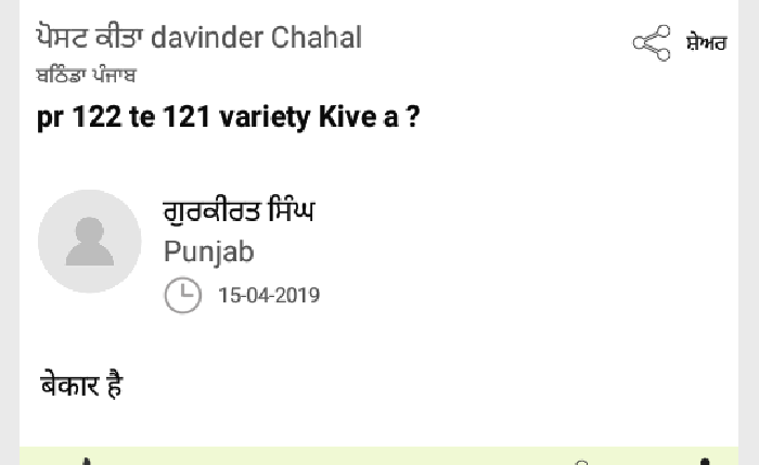 Davinder Chahal g PR 122 and 121 dono hi vdia yield waliyan varieties han and PAU walo recomended v han. tuc eh kisam lga skde ho g. PR 122 da yield 31.5 quiental per acre hai and eh kisam 147 days vich pakk ke tyar ho jndi. PR 121 variety da yield 30.5 quiental per acre hai and eh kisam 140 days vich pakk ke tyar ho jndi g.