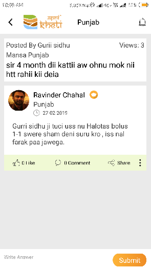 ਗਾਂ ਨੂੰ ਪੇਟ ਦੇ ਕੀੜਿਆਂ ਲਈ Flukrid-ds ਦਵਾਈ ਦੀ ਗੋਲੀ ਦਿਓ ਅਤੇ Enerboost ਪਾਊਡਰ 100 ਗ੍ਰਾਮ ਰੋਜਾਨਾ ਦੇਣਾ ਸ਼ੁਰੂ ਕਰੋ, ਇਹ Animix pharma company ਦਾ ਪ੍ਰੋਡਕਟ ਹੈ, ਇਸ ਨਾਲ ਵਧਿਆ ਗਰੋਥ ਹੋ ਜਾਵੇਗੀ, ਬਾਕੀ ਪਸ਼ੂਆਂ ਦੇ ਰਹਿਣ ਸਹਿਣ ਦਾ ਪੂਰਾ ਧਿਆਨ ਰੱਖੋ ਜੀ