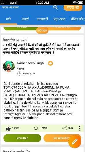 Gulli dande di roktham lyi iss sme tuc TOPIK@160GM JA AXIAL@400ML JA PUMA POWER@400ML JA LEADER@13GM ja SAFAL@13GM JA UPL di SHAGUN 21-11@200gm nu 150 ltr paani de nal mila ke prati acre te spray kr skde ho. ihna de vicho koi v ikk spray vart skde ho. topik di jgah tuc ihh spreha vart skde ho. jekar bathoo hai tan uss de lyi algrip@10gm ja total@16gm nu 150 ltr paani de nal mila ke prati acre te spray kr skde ho .