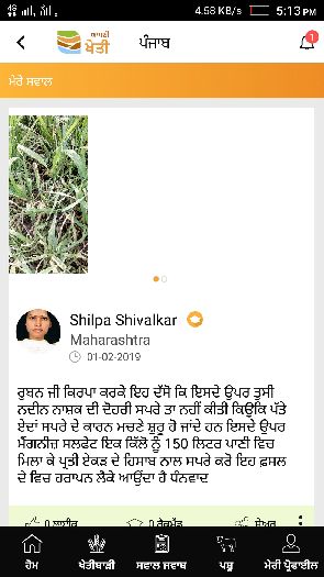 ਰੁਬਨ ਜੀ ਕਿਰਪਾ ਕਰਕੇ ਇਹ ਦੱਸੋ ਕਿ ਇਸਦੇ ਉਪਰ ਤੁਸੀ ਨਦੀਨ ਨਾਸ਼ਕ ਦੀ ਦੋਹਰੀ ਸਪਰੇ ਤਾ ਨਹੀਂ ਕੀਤੀ ਕਿਉਕਿ ਪੱਤੇ ਏਦਾਂ ਸਪਰੇ ਦੇ ਕਾਰਨ ਮਚਣੇ ਸ਼ੁਰੂ ਹੋ ਜਾਂਦੇ ਹਨ ਇਸਦੇ ਉਪਰ ਮੈਂਗਨੀਜ਼ ਸਲਫੇਟ ਇਕ ਕਿੱਲੋ ਨੂੰ 150 ਲਿਟਰ ਪਾਣੀ ਵਿਚ ਮਿਲਾ ਕੇ ਪ੍ਰਤੀ ਏਕੜ ਦੇ ਹਿਸਾਬ ਨਾਲ ਸਪਰੇ ਕਰੋ ਇਹ ਫ਼ਸਲ ਦੇ ਵਿਚ ਹਰਾਪਨ ਲੈਕੇ ਆਉਂਦਾ ਹੈ ਧੰਨਵਾਦ