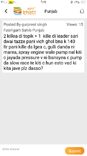 ਸ਼੍ਰੀਮਾਨ ਆਮ ਤੌਰ \'ਤੇ, ਕਣਕ ਵਿੱਚ ਗੁੱਲੀ ਡੰਡਾ 35-40 ਦਿਨਾਂ ਵਿਚ ਬਾਹਰ ਆ ਜਾਂਦੀ ਹੈ.ਜਦੋਂ ਤੁਸੀਂ ਪਹਿਲਾਂ ਪਾਣੀ ਲਗਾਉਂਦੇ ਹੋ, ਗੁੱਲੀ ਡੰਡਾ ਕਣਕ ਦੇ ਨਾਲ-ਨਾਲ ਵਧਣਾ ਸ਼ੁਰੂ ਹੋ ਜਾਂਦਾ ਹੈ. ਇਸ ਸਮੇਂ ਕਣਕ ਲਗਭਗ 40 ਦਿਨਾਂ ਦੀ ਹੋ ਜਾਂਦੀਹੈ. ਇਸ ਵੇਲੇ ਅਸੀਂ TOPIK@160GM ਜਾਂ AXIAL@400ML ਜਾਂ PUMA POWER@400ML ਜਾਂ LEADER@13GM ਜਾਂ SAFAL@13GM ਜਾਂ UPL ਦੀ SHAGUN 21-11@200gm ਨੂੰ 150 ਲੀਟਰ ਪਾਣੀ ਵਿੱਚ ਮਿਲਾਕੇ ਪ੍ਰਤੀ ਏਕੜ ਤੇ ਸਪਰੇ .... (Read More)