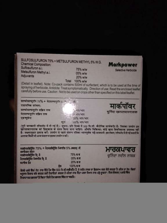 markpower ik nadeen nashak hai . isde vich Sulfosulfuron 75% Metsulfuran Methyl 5% nam da salt maujood hunda hai.eh gulli dande ate bathu di roktham karda hai.isdi matra ik acre vich 16gm di varto kiti jandi hai.isda result vdia hai.
