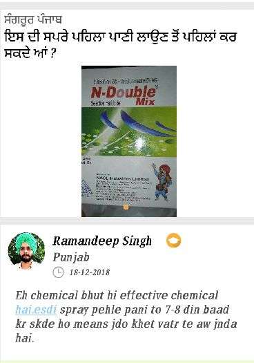 आमतौर पर गेहूं में गुली डंडा 35—40 दिनों में ही बाहर निकलता है जब आप पहला पानी लगाते हैं तो यह गुली डंडा गेहूं के साथ साथ बढ़ना शुरू हो जाता है इस समय गेहूं 40 दिनों के आस पास हो जाती है इस समय आप TOPIK@160GM याAXIAL@400ML याPUMA POWER@400ML या LEADER@13GM या SAFAL@13GM या UPL की SHAGUN 21-11@200gm को 150 लीटर पानी में मिलाकर प्रति एकड़ पर स्प्रे कर सकते हैं इनमें से .... (Read More)