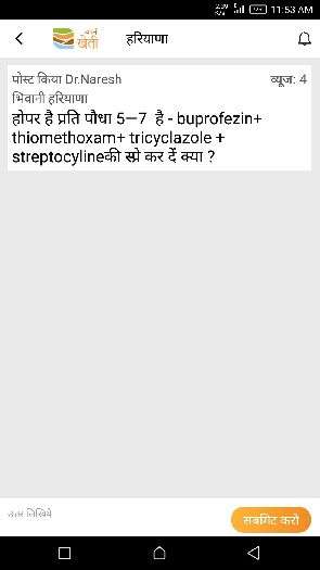 tricyclazole + streptocycline दोनों ही फंगसनाशी है अगर धान में कोई फंगस की समस्या है तो इसकी स्प्रे कर सकते हैं Buprofenzin hopper को कंटरोल करता है Buprofenzin की डोज़ 200—250 मि.ली. प्रति एकड़ है अगर 5—7 होपर प्रति पौधा है तो आप इसकी स्प्रे कर सकते हैं thiamethoxam काले तेले को मारता है इसकी डोज़ 80—100 ग्राम प्रति एकड़ है