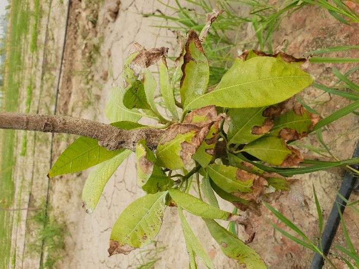 यह पोटाश की कमी है इसे ठीक करने के लिए प्रति पौधा 150-200 ग्राम MOP लागू करें