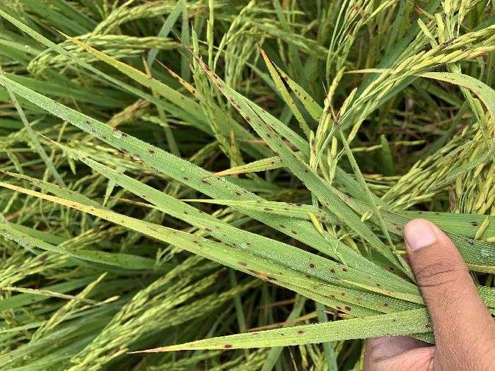 Eh daane daagi ate patteya uper dhabbe fungus de karn ban rahe han isdi roktham de layi tuc tilt@200ml nu 150 litre pani vihc mila ke prati acre de hisab nal spray karo.