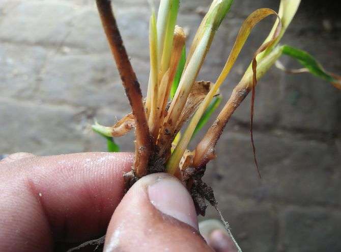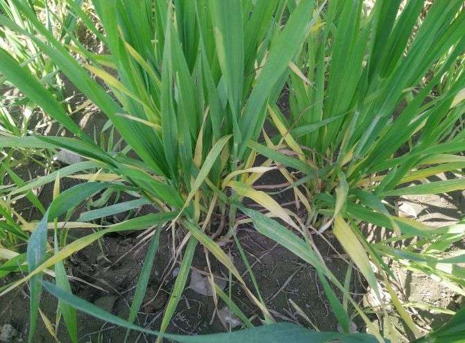 ਇਸ ਵਿੱਚ ਮੈਗਨੀਜ਼ ਦੀ ਘਾਟ ਆ ਰਹੀ ਹੈ, ਜਿਸ ਕਾਰਨ ਪੀਲਾ-ਪਨ ਆ ਰਿਹਾ ਹੈ। ਇਸ \'ਤੇ 1 ਕਿਲੋ manganese sulphate ਨੂੰ 150 ਲੀਟਰ ਪਾਣੀ ਨਾਲ ਮਿਲਾ ਕੇ ਪ੍ਰਤੀ ਏਕੜ \'ਤੇ ਸਪਰੇਅ ਕਰੋ। ਇਸ ਨਾਲ ਪੀਲਾ-ਪਨ ਦੂਰ ਹੋ ਜਾਵੇਗਾ।