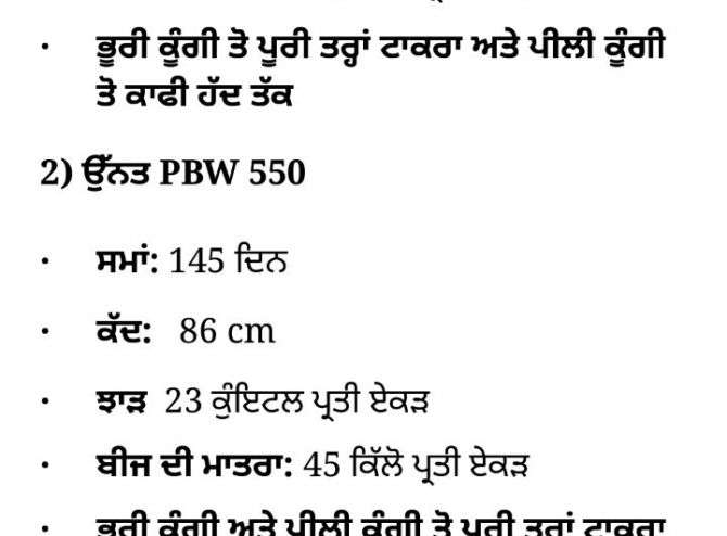 ਉੱਨਤ PBW 550 ਸਮਾਂ: 145 ਦਿਨ ਕੱਦ: 86 cm ਝਾੜ 23 ਕੁੰਇਟਲ ਪ੍ਰਤੀ ਏਕੜ ਬੀਜ ਦੀ ਮਾਤਰਾ: 45 ਕਿੱਲੋ ਪ੍ਰਤੀ ਏਕੜ ਭੂਰੀ ਕੂੰਗੀ ਅਤੇ ਪੀਲੀ ਕੂੰਗੀ ਤੋ ਪੂਰੀ ਤਰ੍ਹਾਂ ਟਾਕਰਾ